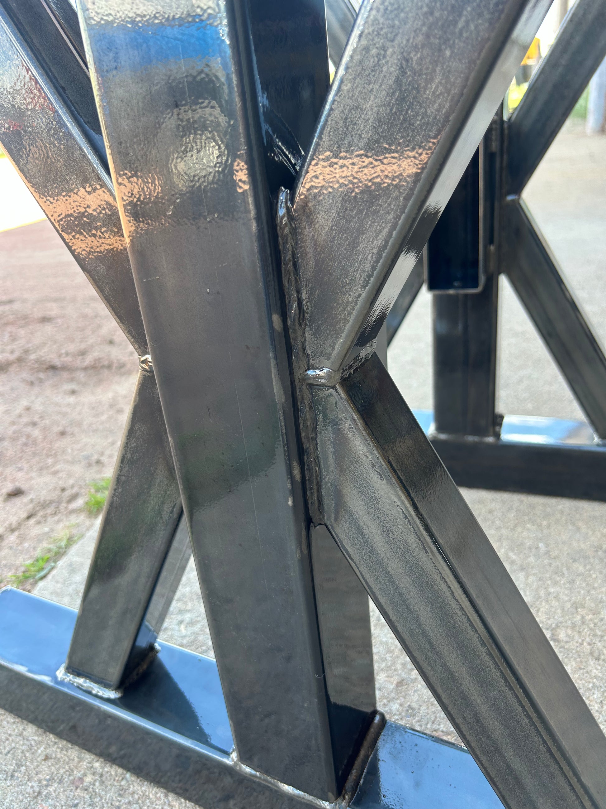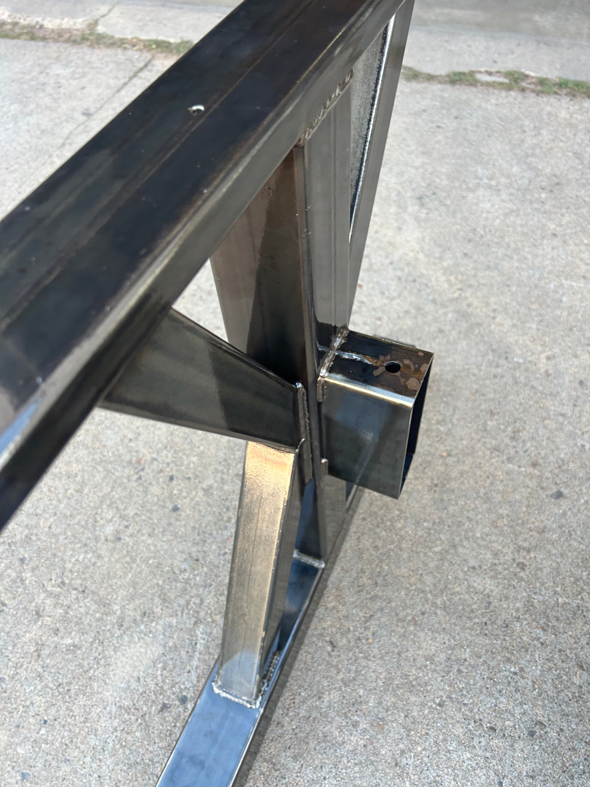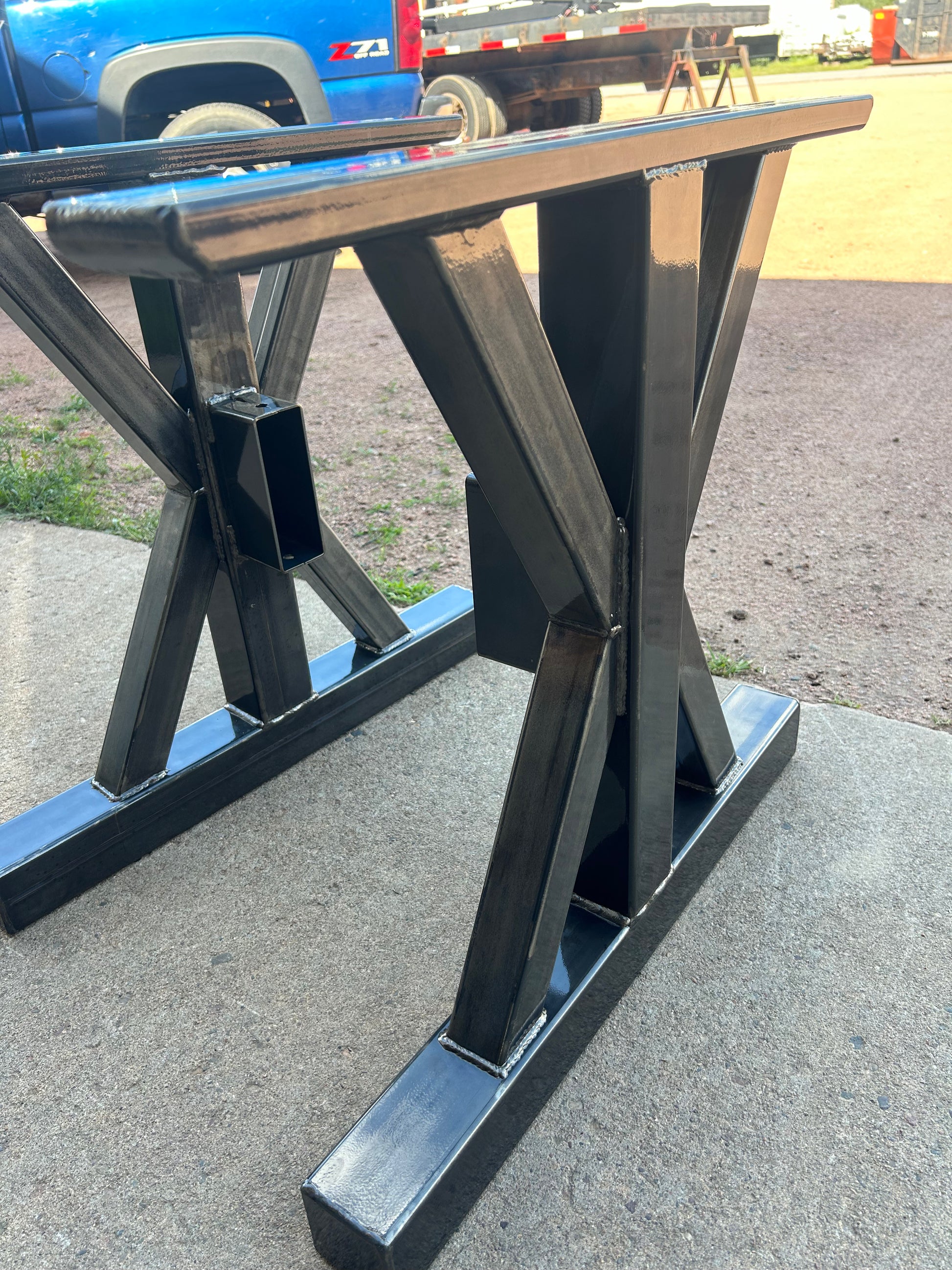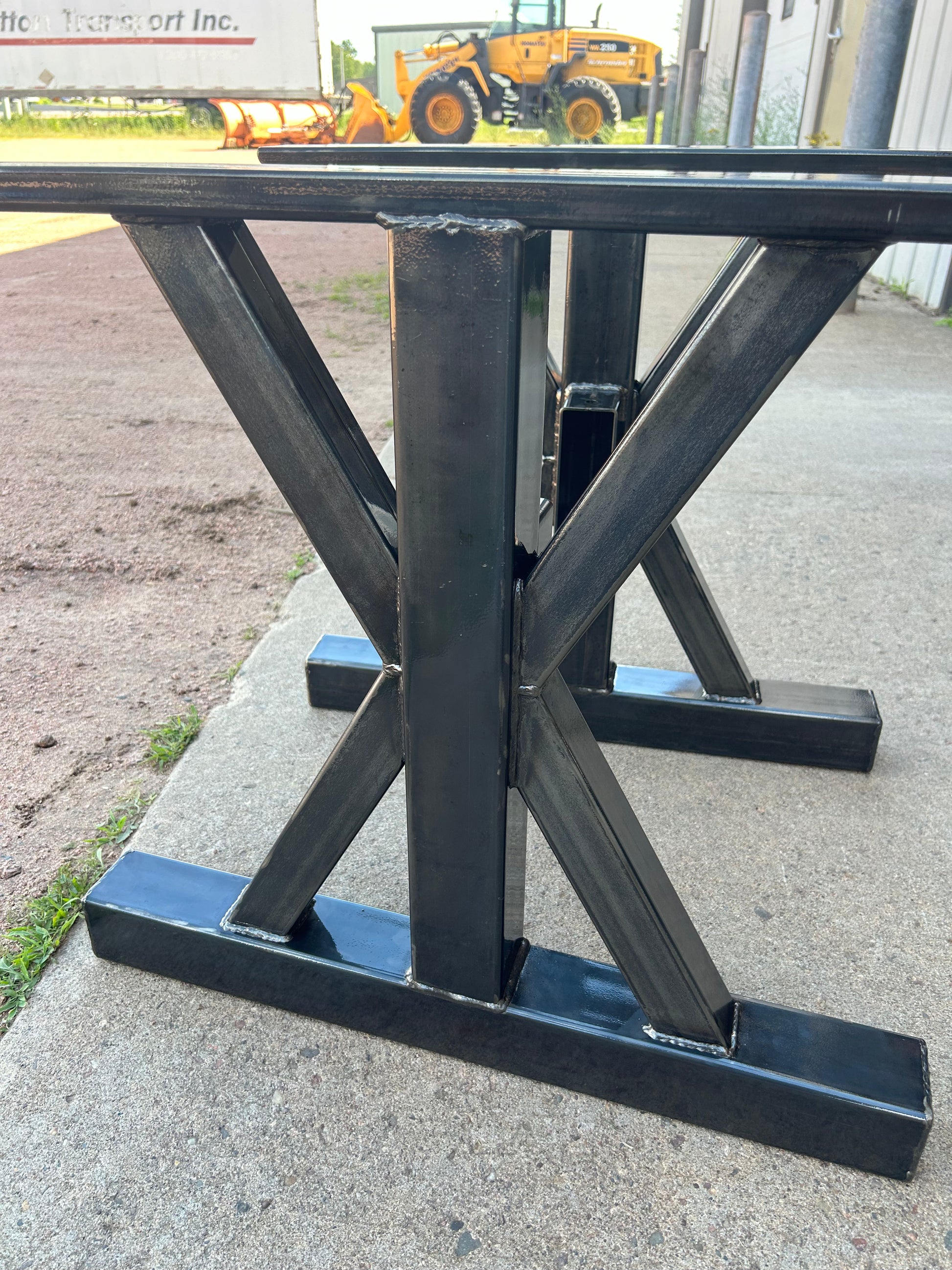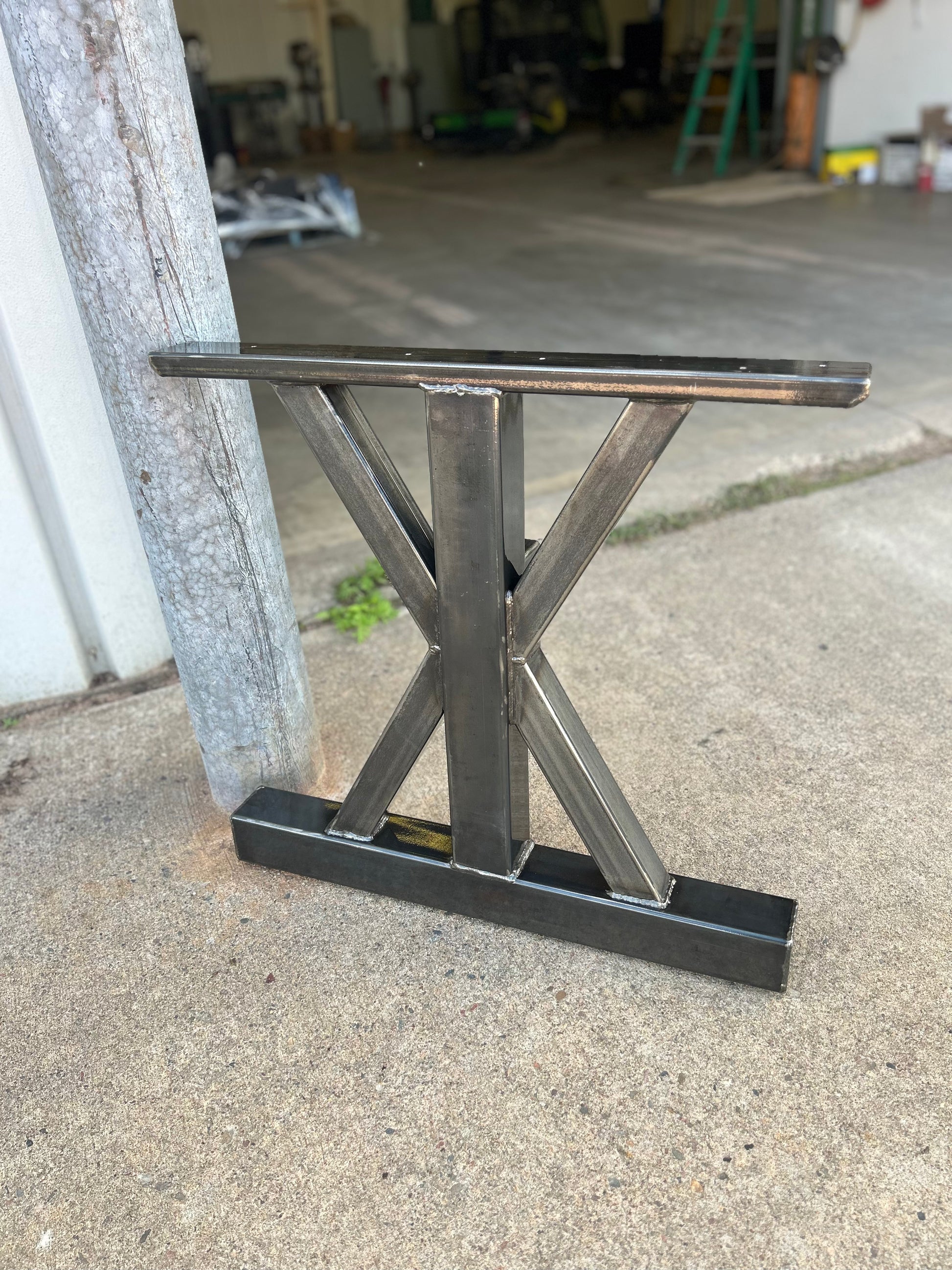 We have an extra set of table legs available. These would be great for a DIY table project. They have a raw steel look and and have been powder coated clear. Over all dimensions are 28" wide and 26" tall, top and bottom tube are 3" wide. Table top pictured is not included.